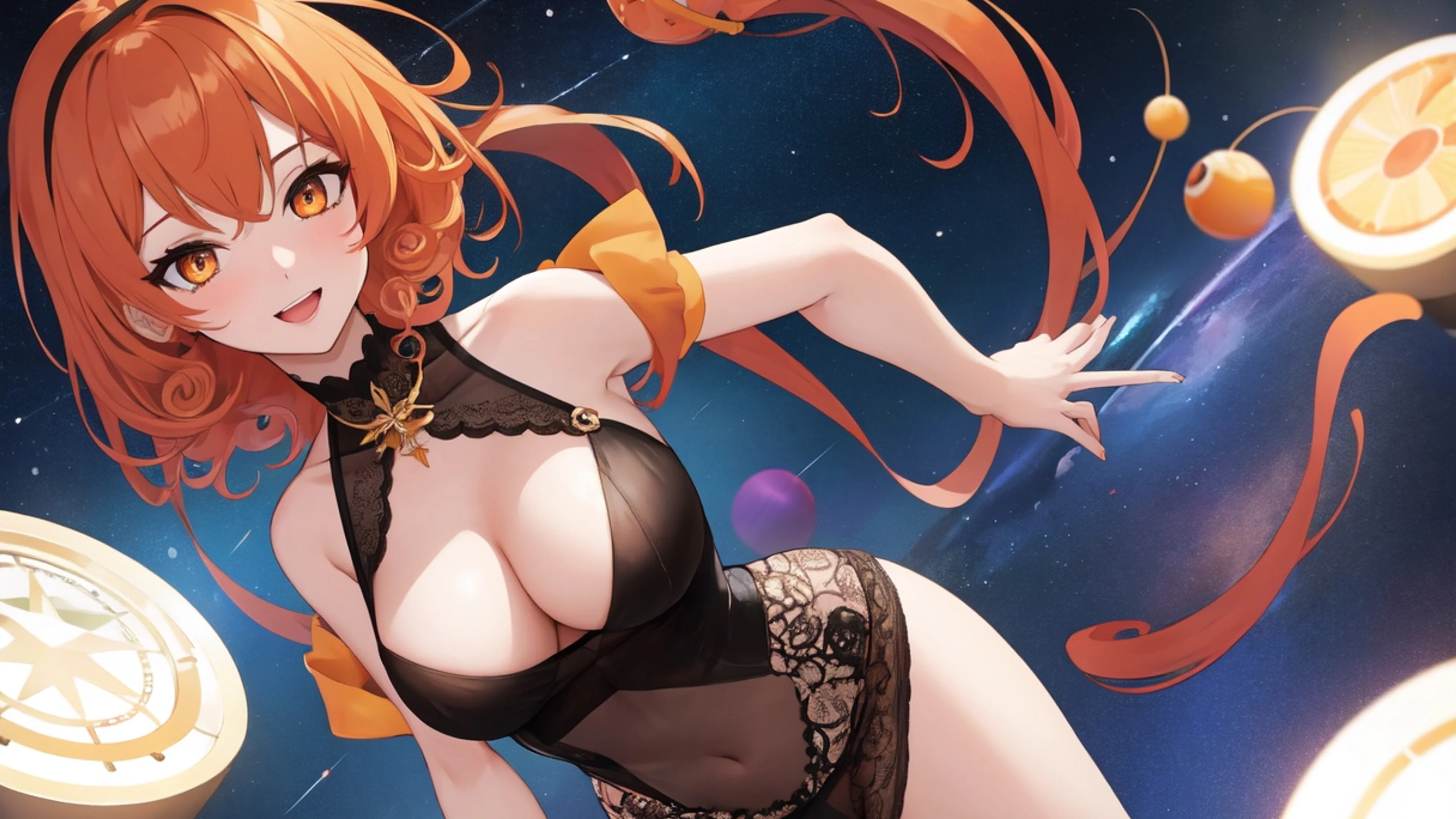 The Galactic Healer Priestess — Soft Lingerie Memory Match puzzle showcases a stunning anime illustration of a curvy woman in her 20s, set against the backdrop of a futuristic space station. Her sky.