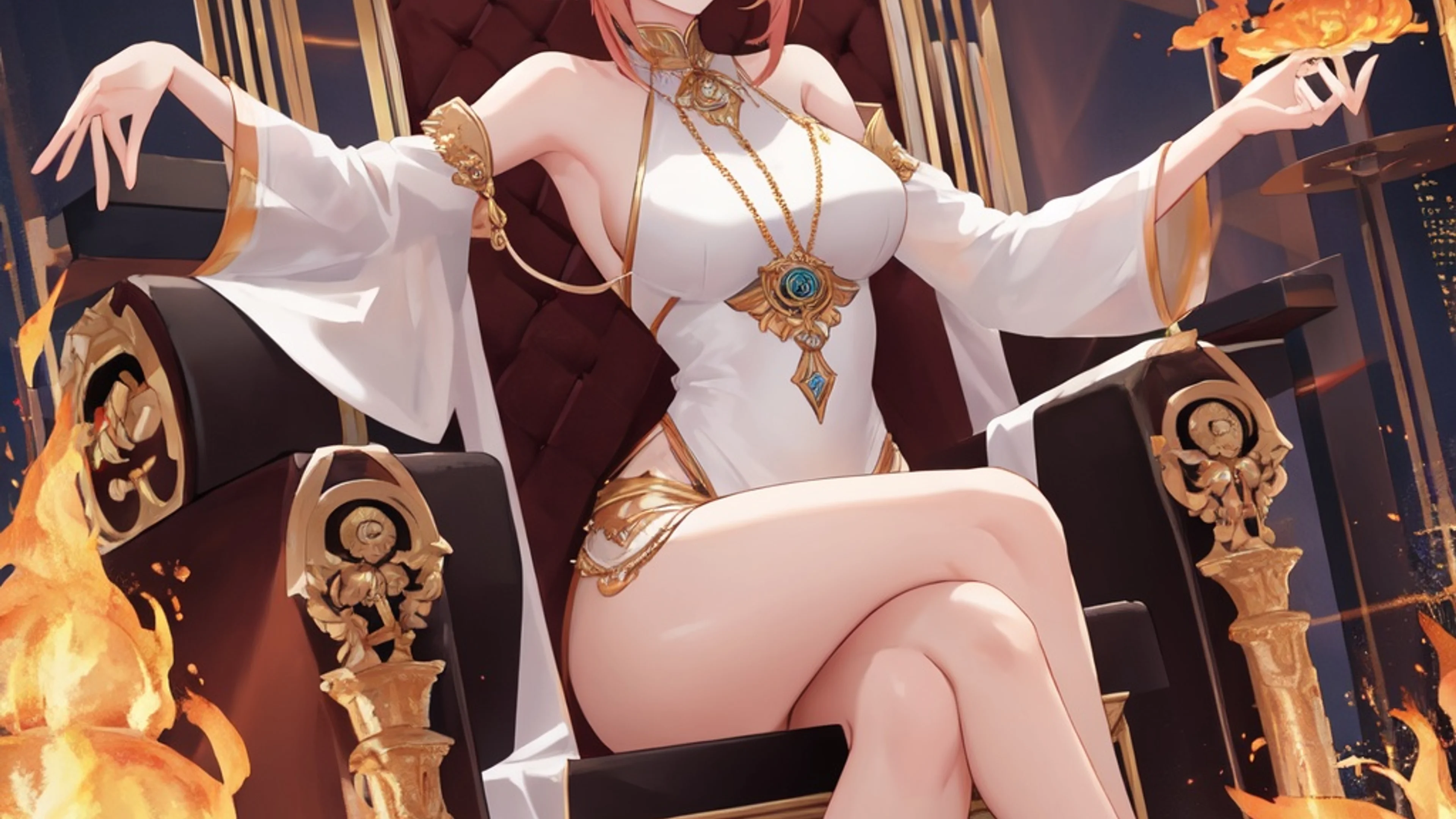 The Cheerleader Queen: Harmonize Word Reveal Challenge presents a stunning anime illustration of a young adult woman, poised elegantly on a throne situated on a floating island. Her rose gold hair ca.