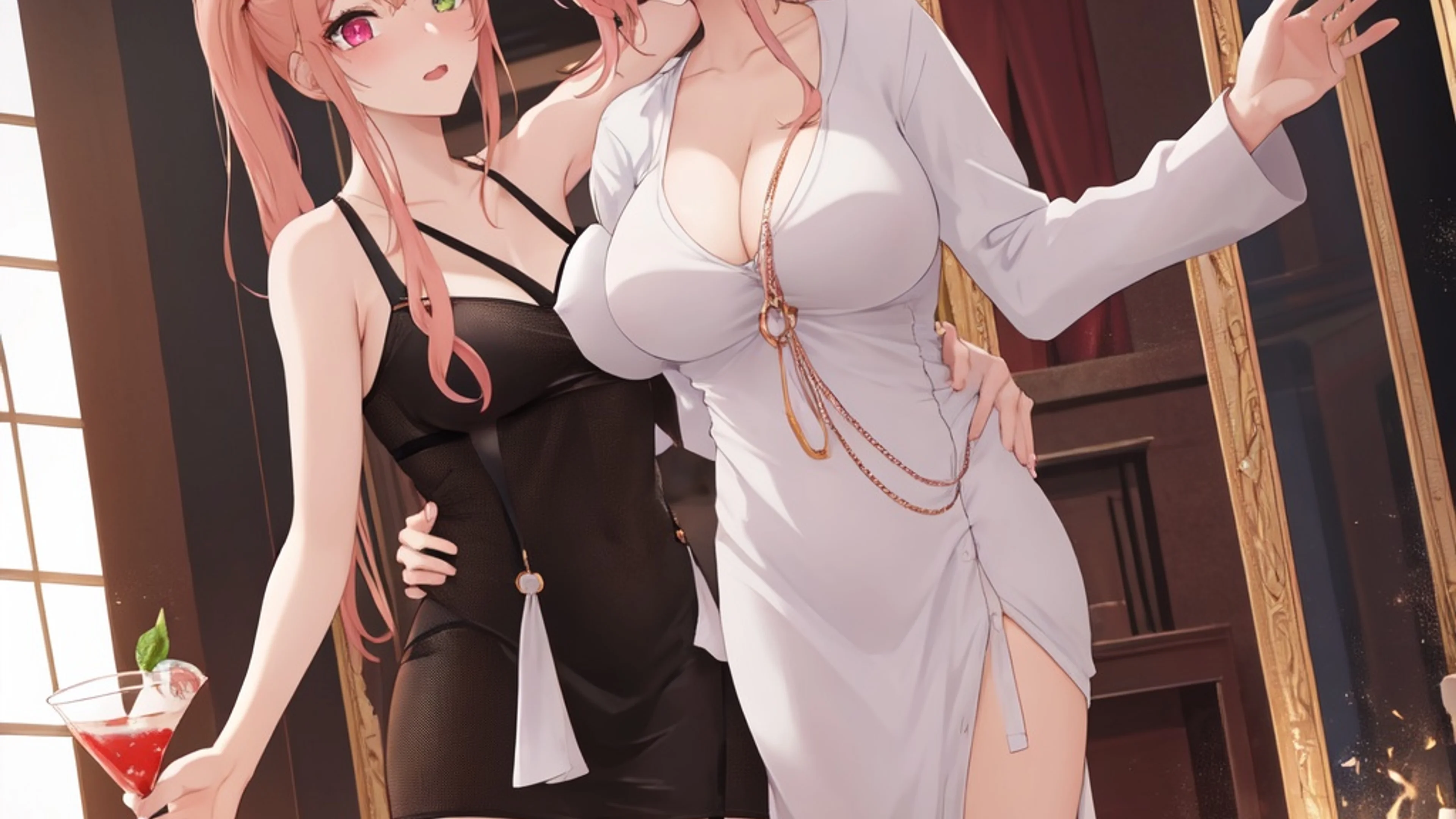 The Romantic Duo Treasure Lair Word Reveal Challenge presents a breathtaking watercolor anime illustration of two elegant women in their 20s, situated in a vibrant dragon's treasure lair. The artwork.