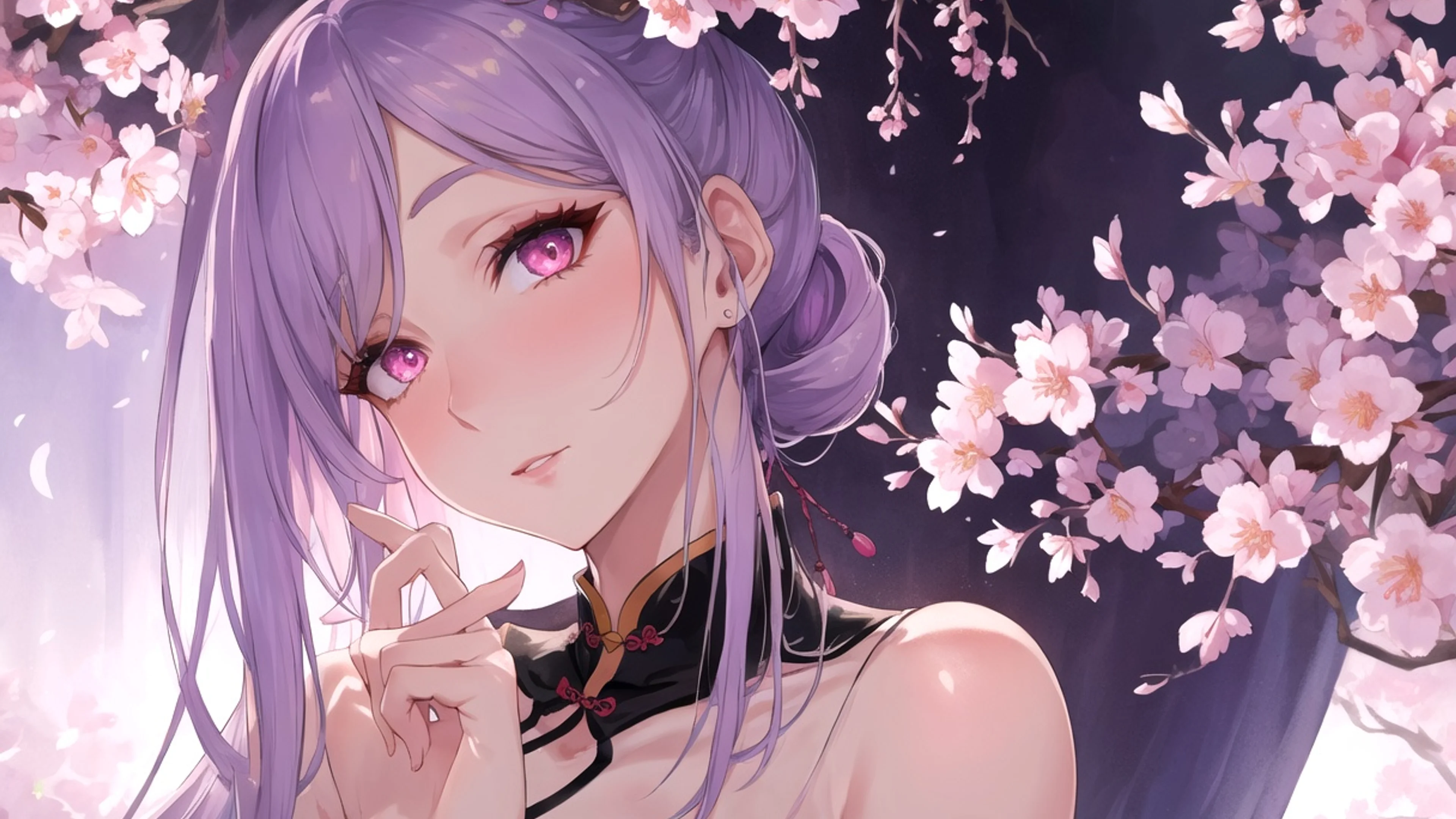 Mature Lavender Qipao Influencer In Cherry Blossom Garden — Wallpaper