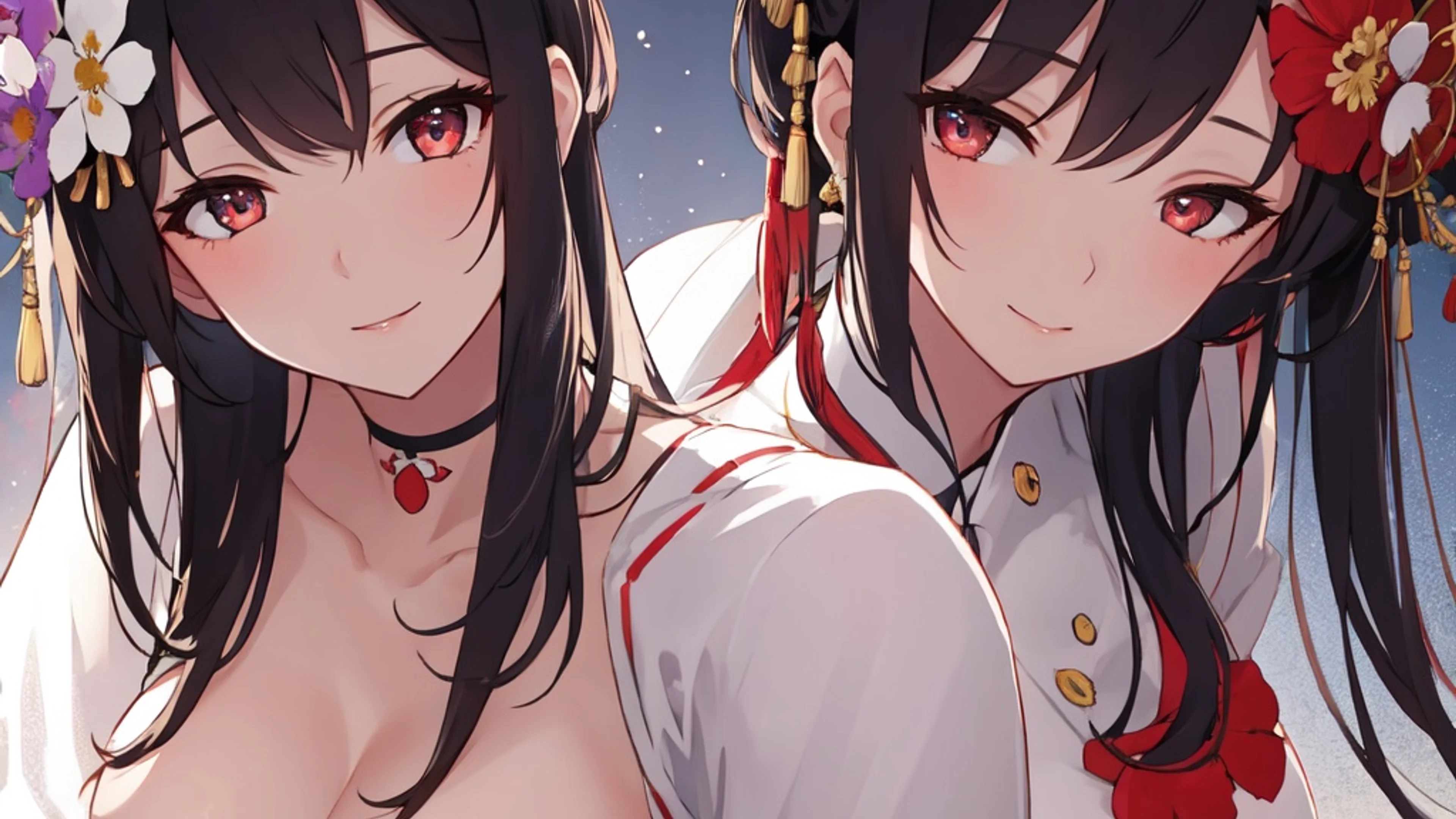 The Puzzle Yuri Kissing Scene is a breathtaking masterpiece that depicts two adult women, a geisha and a nurse, embracing passionately in a colorful flower meadow. The artwork features beautiful face.