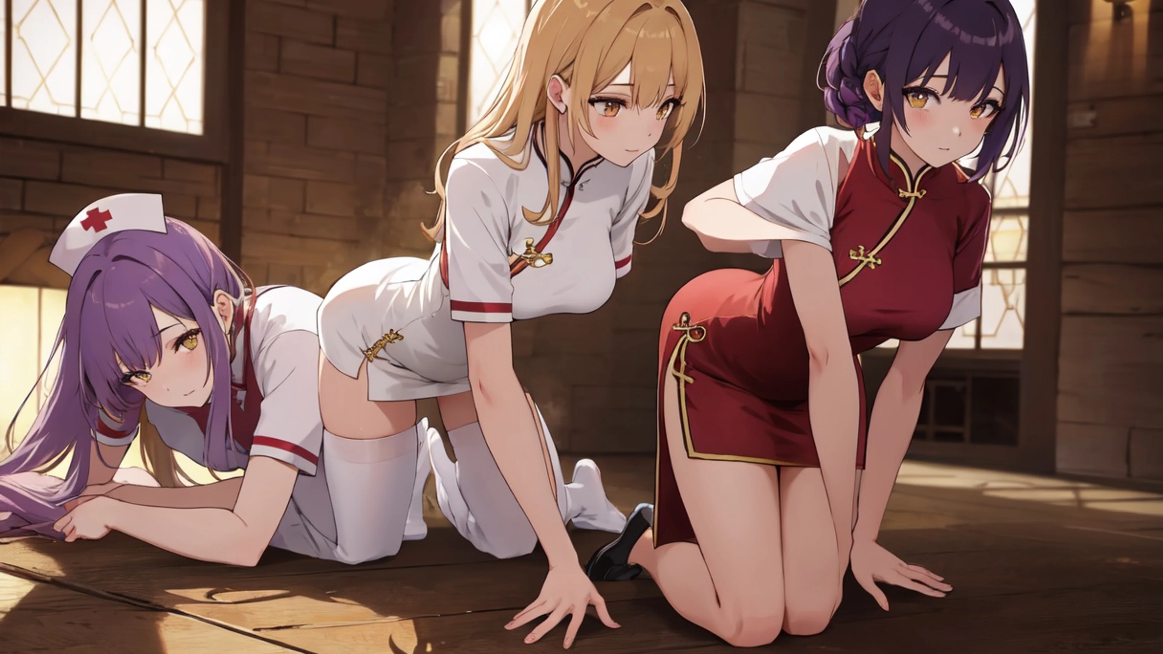 The Puzzle Yuri Kissing Scene is a breathtaking masterpiece that depicts two adult women, a geisha and a nurse, embracing passionately in a colorful flower meadow. The artwork features beautiful face.