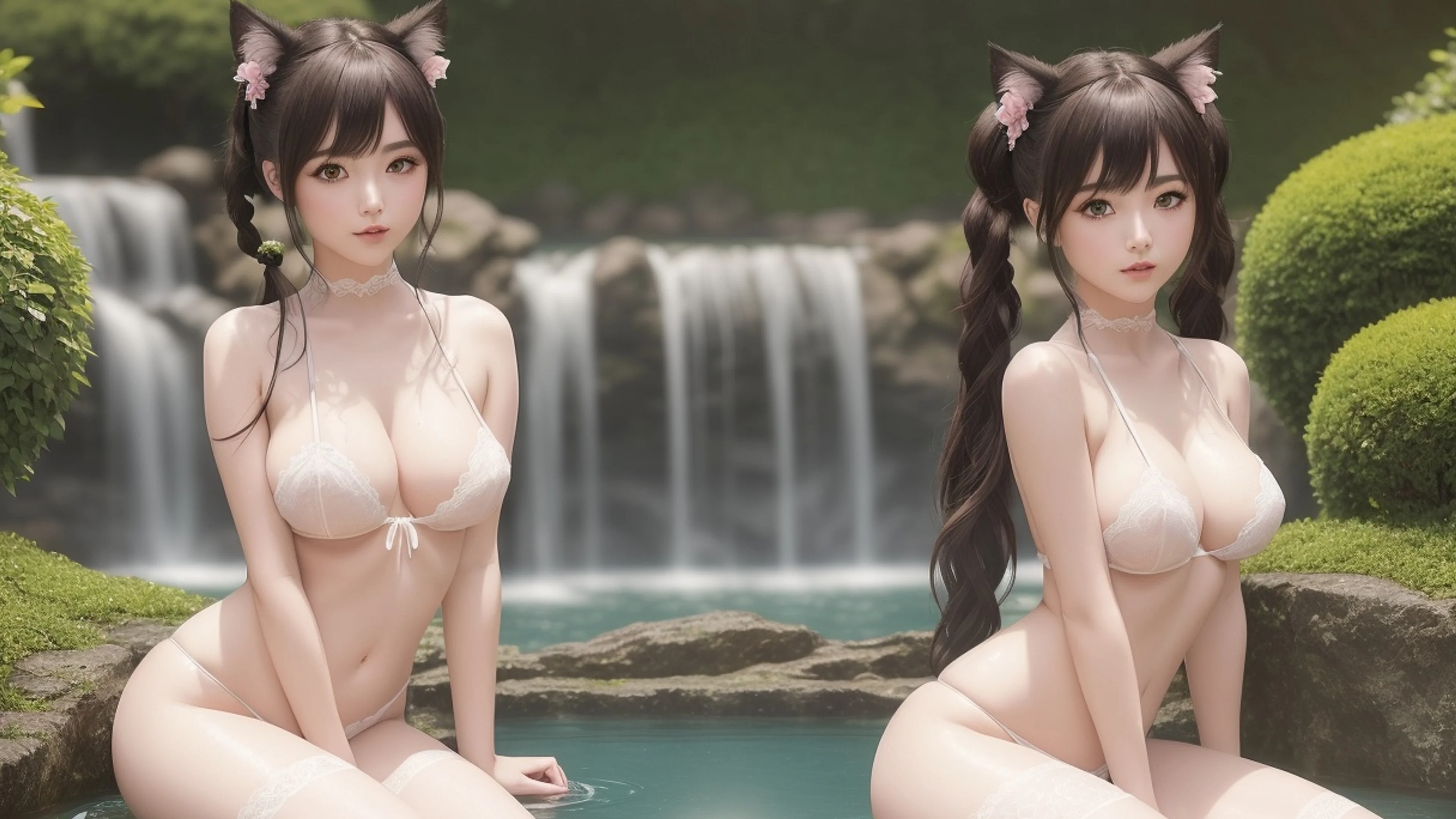 Whispers By The Waterfall: Catgirl Embrace Puzzle Wallpaper desktop preview